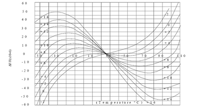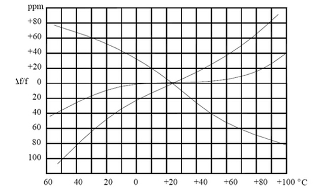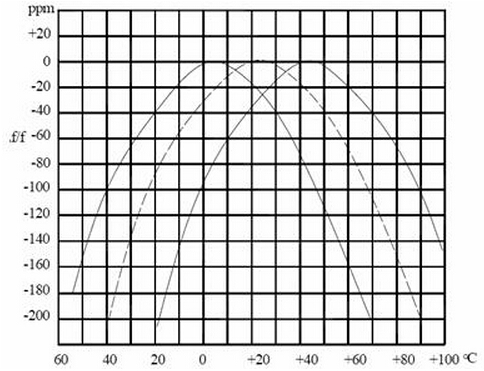 在切割晶體和bt切割晶體具有不同的角度切割(35度對在根本上與49度對bt切割).這兩種類型有相同的振動模式(厚度剪切).然而,在50MHz基本BT切晶體略厚(2mils)相比,其在減少(1.3mils).在切割和切割時,有不同的溫度和頻率曲線.(見圖4,5和6)