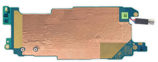 緊接著來看一下主板正面芯片布局詳解,現(xiàn)在看到的是主板背面,啥也沒有,只貼著一層銅箔.總的來說,HTC對于驍龍810的處理很簡單,沒有加強散熱手段,也沒有更高級的電源管理,難怪要比nubia Z9 Max熱得多!主板去掉了,才能取下電池.HTC還真是固執(zhí)啊.