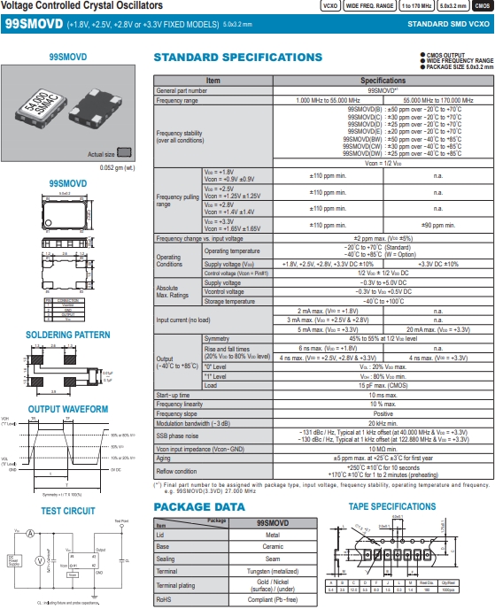 SMI晶體,石英晶體振蕩器,99SMOVD晶振.有源貼片石英晶振外觀使用金屬材料封裝的,具有高穩(wěn)定性,高可靠性的石英晶體諧振器,晶振外觀本身使用金屬封裝,充分的密封性能,可確保其高可靠性,采用編帶包裝,外包裝采用朔膠盤,可在自動貼片機上對應(yīng)自動貼裝等優(yōu)勢.