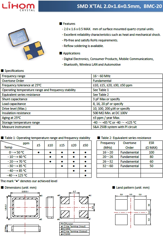 | Lihom晶振 | 單位 | BMC-20晶振 | 石英晶振基本條件 |