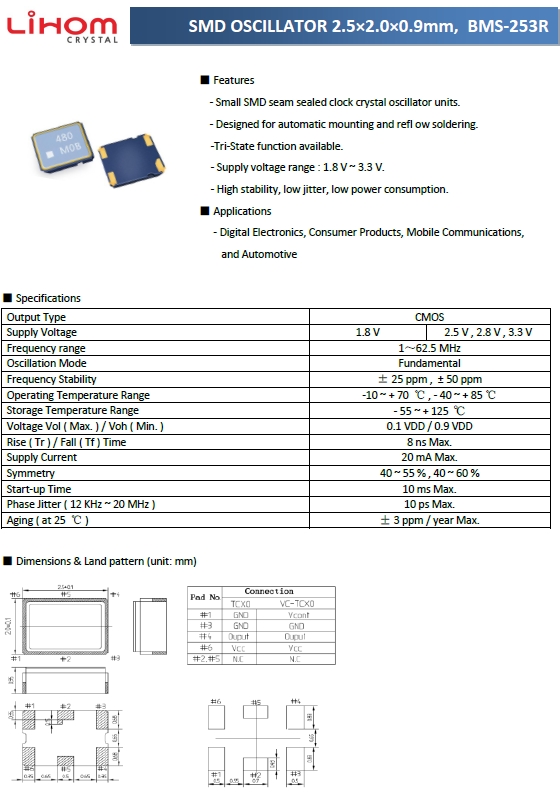 Lihom晶振,有源晶振,BMS-253R振蕩器.在辦公自動化,家電相關電器領域及Bluetooth,Wireless LAN等短距離無線通信領域可發揮優良的電氣特性,滿足無鉛焊接的回流溫度曲線要求.