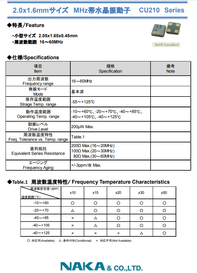 NAKA晶振,SMD晶振,CU210水晶振子.該產(chǎn)品本身具有耐熱,耐振,耐撞擊等優(yōu)良的耐環(huán)境特性,滿足無鉛焊盤以及高溫回流溫度曲線要求,符合AEC-Q200認(rèn)證.