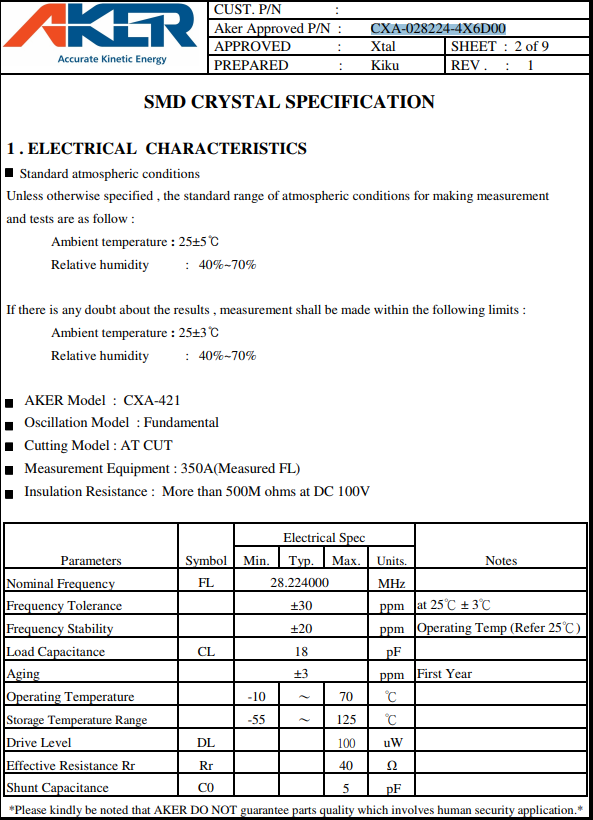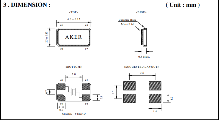 AKER石英晶振可能會在某些條件下受到損壞.例如從桌上跌落或在貼裝過程中受到沖擊.如果產品已受過沖擊請勿使用.