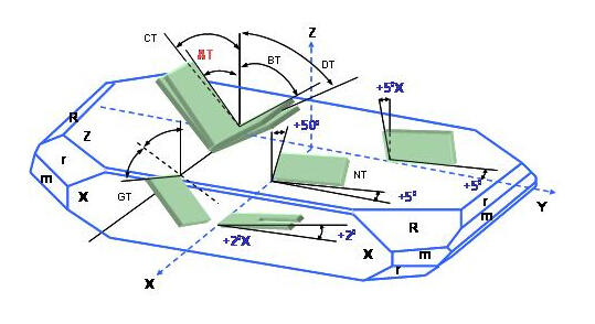 依據(jù)不同的應用領域及工作溫度需求, 因應了許多不同的石英切割角度種類. 例如AT-, BT-, CT-, DT-, NT, GT…..等不同的切割板片. 不同的切割方向的板片具有不同的彈性常數(shù)張量(elastic constant tensor), 不同的壓電常數(shù)張量(piezoelectric constant tensor)及不同的介電常數(shù)張量(dielectric constant tensor). 這些張量在石英組件的設計及應用上展現(xiàn)了不同的振蕩及溫度特性. (圖三)表現(xiàn)了在Z-plat石英結(jié)構(gòu)上,幾種不同方向的石英板片切割方式.