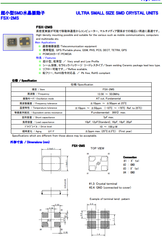 富士晶體,無(wú)源晶振,FSX-2MS諧振器.智能手機(jī)水晶振子,產(chǎn)品具有高精度小型的表面貼片型石英晶體振蕩器,適用于移動(dòng)通信終端的基準(zhǔn)時(shí)鐘等移動(dòng)通信領(lǐng)域.比如智能手機(jī),無(wú)線通信,衛(wèi)星導(dǎo)航,平臺(tái)基站等數(shù)碼產(chǎn)品類(lèi)別,晶振本身小型,薄型具備各類(lèi)移動(dòng)通信的基準(zhǔn)時(shí)鐘源用頻率,貼片晶振具有優(yōu)良的電氣特性,耐環(huán)境性能適用于移動(dòng)通信領(lǐng)域,滿(mǎn)足無(wú)鉛工作的高溫回流溫度曲線要求.
