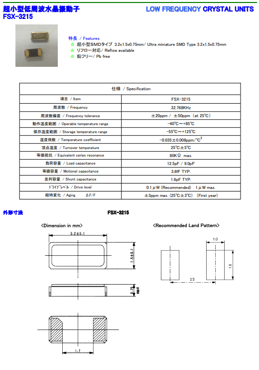 富士晶體,音叉水晶振子,FSX-3215諧振器.小型,薄型,質地輕的表面貼片音叉型晶體諧振器,手機晶體,產品體積小,特別適用于各種小巧的便攜式消費電子數碼產品,在移動通信領域廣泛的應用,富士晶振本身可發揮優良的電氣特性,滿足無鉛焊盤的高溫回流溫度曲線要求.