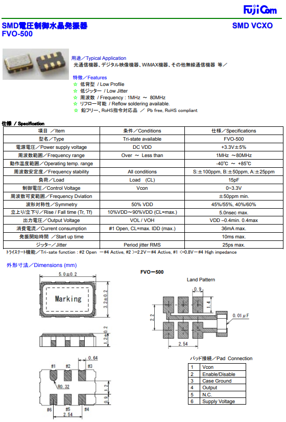 富士晶體,壓控晶振,FVO-500進口晶振.有源晶振,是只晶體本身起振需要外部電壓供應,起振后可直接驅動CMOS集成電路,富士石英晶體本身已實現與薄型IC(TSSOP封裝,TVSOP封裝)同樣的1mm厚度,斷開時的消費電流是15µA以下,編帶包裝方式可對應自動搭載及IR回流焊盤(無鉛對應)產品有幾種電壓供選1.8V,2.5V,3V3.3V,5V,以應對不同IC產品需要.