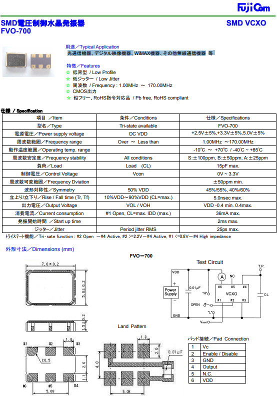 富士晶體,VCXO振蕩器,FVO-700石英振蕩子.貼片式石英晶體振蕩器,低電壓啟動功率,并且有多種電壓供選擇,比如有1.8V,2.5V,3.3V,3.8V,5V等,富士晶振被廣泛應用于,平板筆記本,衛(wèi)星系統(tǒng),光纖通道,千兆以太網(wǎng),串行ATA,串行連接SCSI,PCI-EXPress的SDH / SONET發(fā)射基站等領域.符合RoHS/無鉛