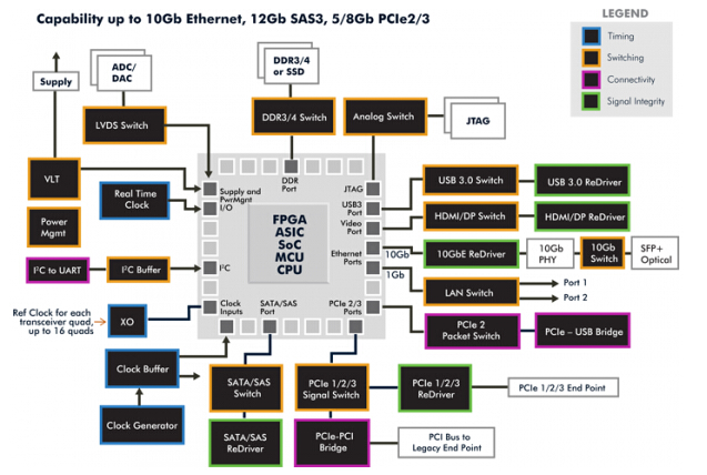 嵌入式應用所使用的處理器包含了從主要CPU、SOC和FPGA供貨商提供的的CPU芯片組,這些芯片組在各個主要的市場區間都有被使用.在Pericom提供的的FPGA應用方塊圖中舉例說明了Pericom可以提供的許多I/O、電力管理和計時功能.
