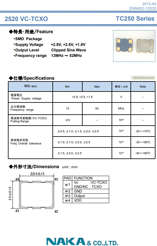 NAKA晶振,壓控溫補(bǔ)振蕩器,TC250壓電石英晶振.貼片石英晶體,體積小,焊接可采用自動貼片系統(tǒng),產(chǎn)品本身小型,表面貼片晶振,特別適用于有小型化要求的電子數(shù)碼產(chǎn)品市場領(lǐng)域,因產(chǎn)品小型,薄型優(yōu)勢,耐環(huán)境特性,包括耐高溫,耐沖擊性等.