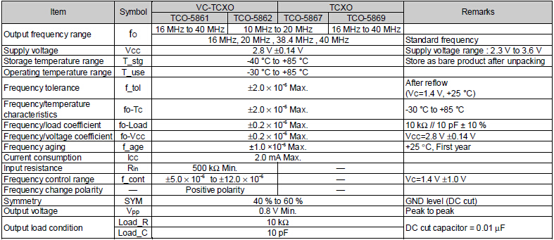 愛普生有源晶振,TCO-5861,5862,5867,5869振蕩器,智能多媒體晶振,頻率范圍10MHz~40MHz,電源電壓2.8V,絕對頻率控制范圍2×10-6,功能使能(OE),外部尺寸規(guī)格3.2×2.5×0.9mm,編帶包裝方式,有源石英晶振,無論是溫補晶體也好,壓控晶振也罷,產(chǎn)品均采用了,離子刻蝕調(diào)頻技術(shù),比目前一般使用的真空蒸鍍方式調(diào)頻.