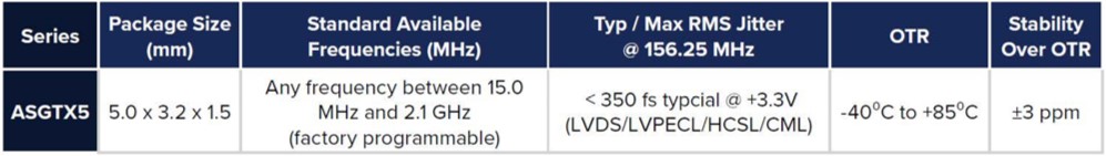 編碼ASGTX5PAD1-156.2500T2,ASGTX5系列采用5.0x3.2x1.8mm SMT封裝,超過了Stratum IV要求的±32 ppm全包穩定性。即使有內置的溫度補償,該系列設備在156.25MHz載波下也表現出典型的RMS抖動性能<350fs。此外,ASGTX5有四種標準差分輸出格式(LVDS、LVPECL或CML),載波頻率在15MHz和2.1GHz之間,HCSL格式最高可達700MHz。該系列非常適合需要嚴格頻率精度、高載波頻率[如1.00GHz]或CML差分輸出的系統。