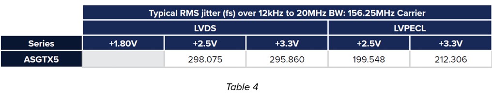 盡管ASGTX5是一種溫度補償解決方案,但Abracon已經制定了特定的設計技術來保持卓越的RMS抖動性能,如下表4所示。