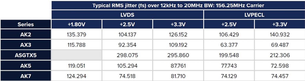 ASGTX5溫補晶體振蕩器(TCXO)解決方案在15.0MHz和2.1GHz之間的任何載波頻率下都能滿足這一嚴格要求。然而,為了實現這一精度,該解決方案的RMS抖動比其第三泛音ClearClock稍差™ 同行。例如,它在156.25MHz載波上表現出<350fs的典型RMS抖動。