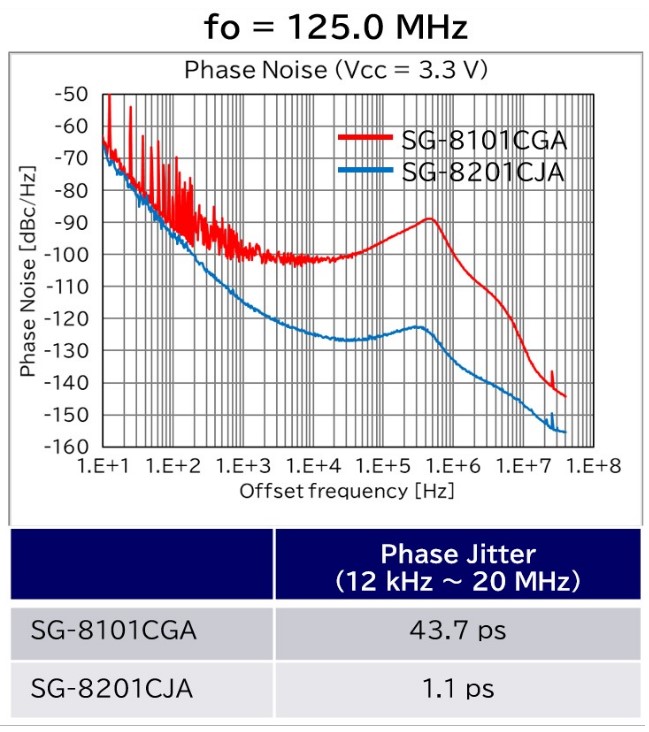 通過利用愛普生新的內(nèi)部IC(在125 MHz的情況下),實(shí)現(xiàn)1.1 ps的典型相位抖動(dòng)(12 kHz至20 MHz)