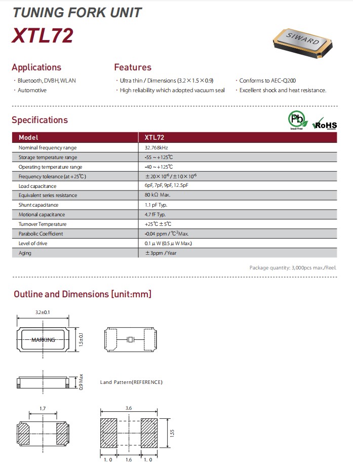 耐高溫6G晶振,XTL721-S999-301,Siward車載電子晶振,32.768KHz晶振,兩腳貼片晶振,參數(shù)表